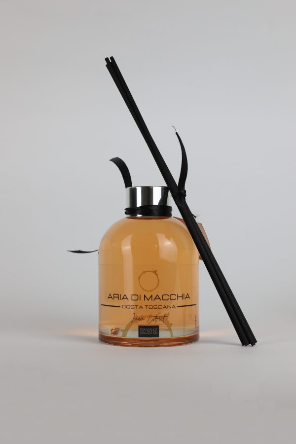 Confezionato in bottiglia in vetro da 200 ml e 5 bastoncini in rattan neri.